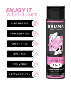 Descubre el placer de la relajación con el **BRUMA – ACEITE DE MASAJE PREMIUM EFECTO CALOR SABOR CHICLE 3 EN 1 – 100 ML**. Este aceite no solo transforma tus masajes en experiencias sensoriales únicas, sino que también aporta un toque de calidez que envuelve tus sentidos. Con su suave efecto calor, alivia tensiones y estrés, creando el ambiente perfecto para momentos íntimos.