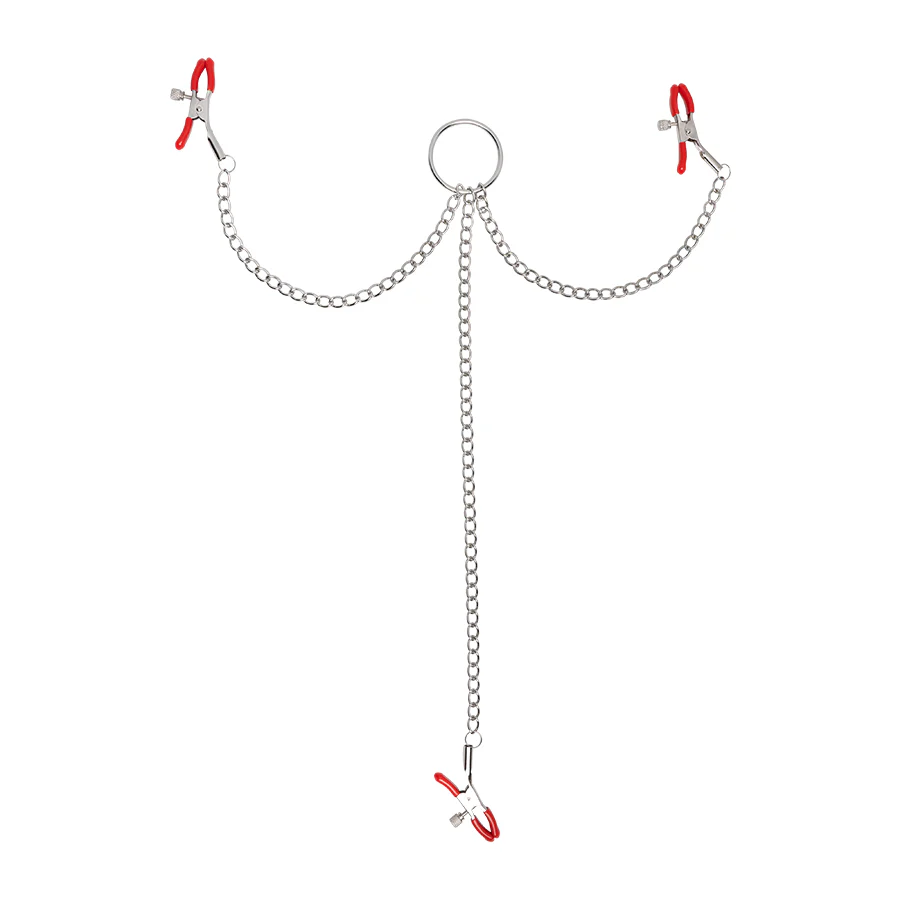 Descubre el placer sin límites con nuestras Pinzas Para Pezones Cadena Clítoris Silver – Red, un accesorio imprescindible para los entusiastas del bondage y la exploración sensorial. Fabricadas con materiales metálicos de alta calidad, estas pinzas no solo son elegantes con su brillante color plateado y rojo, sino que también son eco-amigables y seguras para tu piel.
